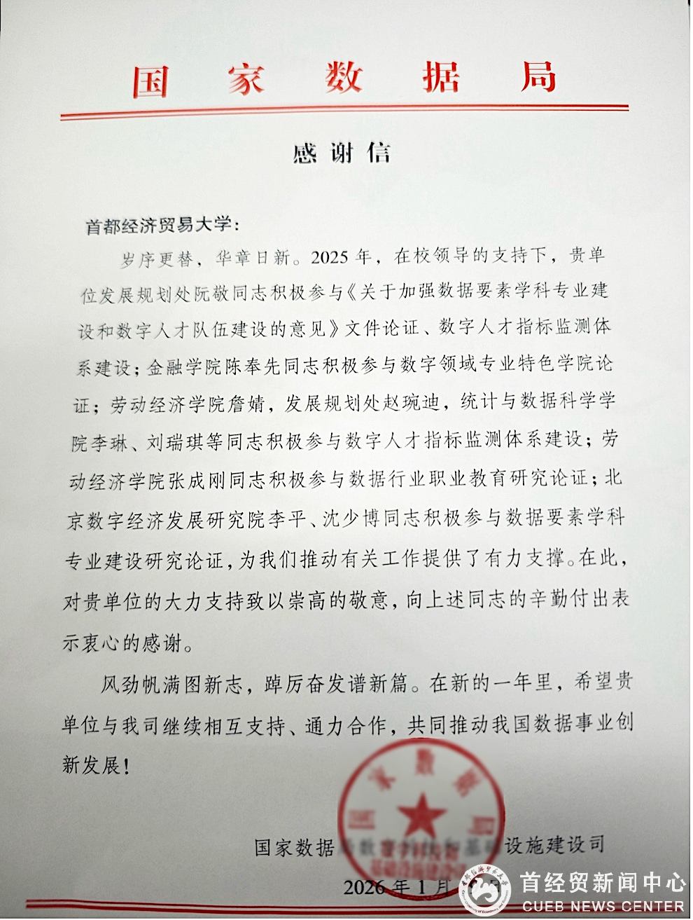 近日,国家数据局发来感谢信,对我校发展规划处、统计与数据科学学院、金融学院、劳动经济学院以及北京数字经济发展研究院的多位师生在数字人才队伍建设与数据要素学科专业建设等工作中所发挥的积极作用表示衷心感谢。